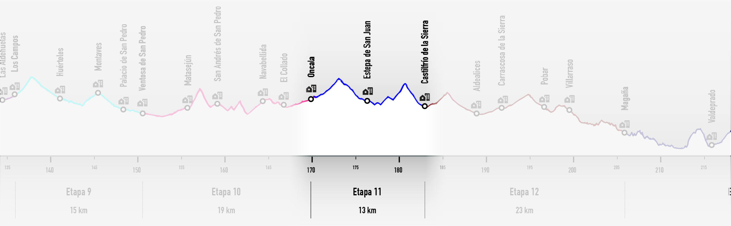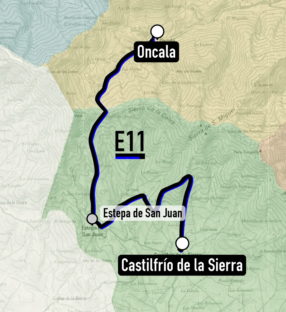 Se sale de Oncala por el camino del puerto, atravesando la dehesa y las espectaculares cuadras del acebal. Tras vislumbrar la cuenca de Soria desde lo alto del Puerto de Oncala, se desciende hacia Estepa de San Juan. Se gira de nuevo hacia la Sierra de Alba para ascender por camino viejo hasta el imponente castro de Castilfrío de la Sierra, población que se alcanza por el camino real que les comunicaba con San Pedro Manrique.