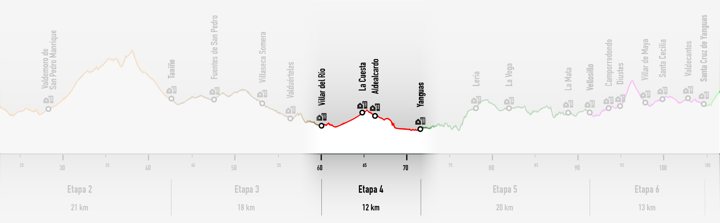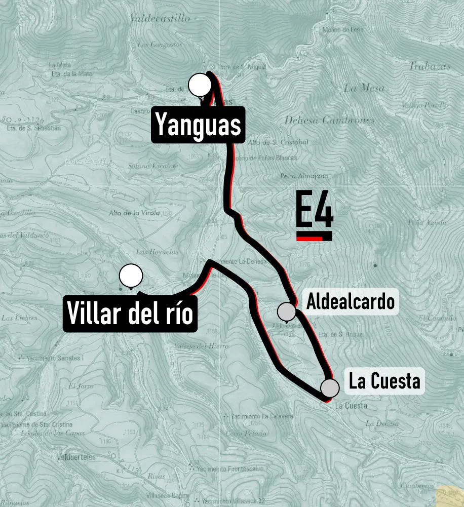 Por el GR86 se deja Villar del Río hacia la pequeña y señorial localidad de La Cuesta. Desde aquí, rumbo Aldealcardo, imponente despoblado a los pies del Pico Ayedo. Se puede optar por visitar la Fuente de aguas Medicinales de Ontálvaro (1,5 km) o continuar recorrido dirección el final de etapa en Yanguas, finalizando por el bonito paseo del río de la localidad.